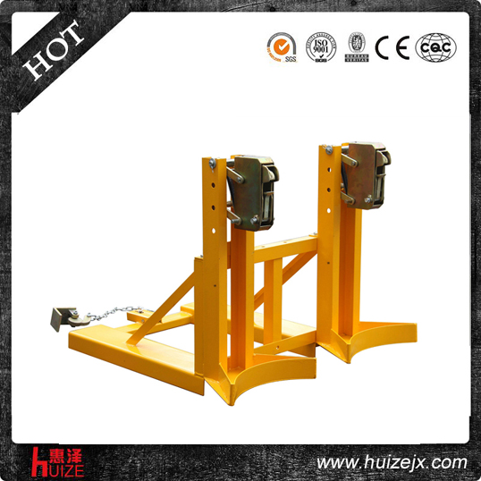 2.大圓弧托架 純機械機構設計可與叉車方便地配合,僅依靠叉車的動作,不需要其它的動力,可自動一次搬運2個桶, 能處理更多類型的桶,包括鋼制油桶和塑料油桶, 能在集裝箱等這樣狹小的環境內裝卸桶裝物質,可極大地提高空間利用率, 與貨叉連接配有自鎖裝置確保油桶夾在坡度上和顛簸路面使用時不會滑落.